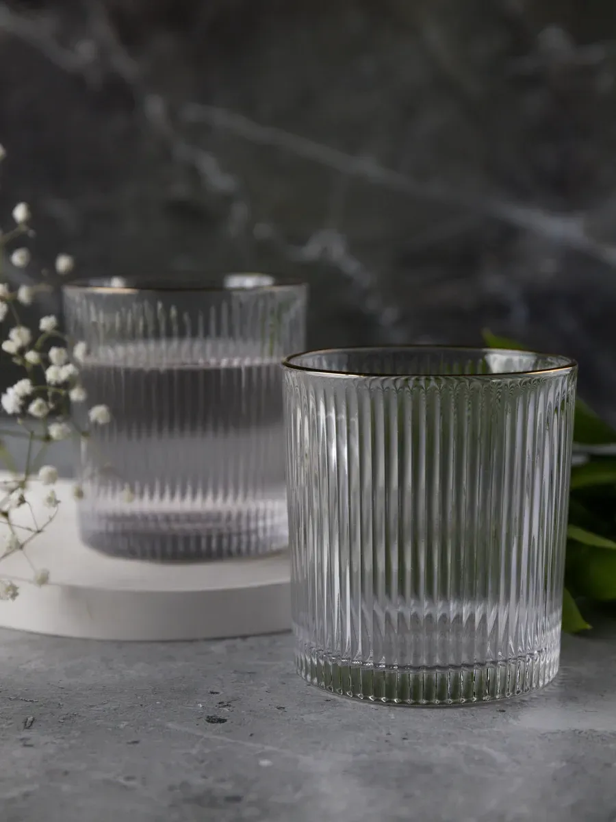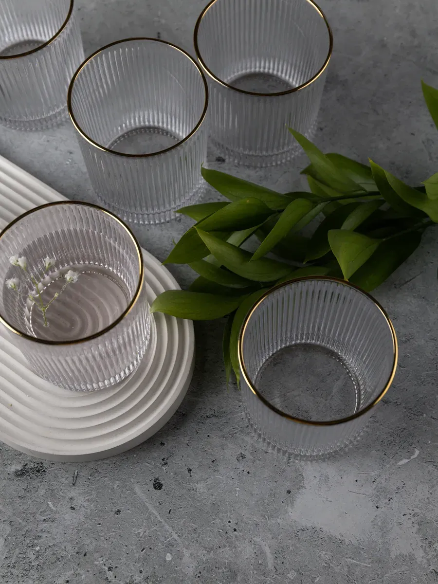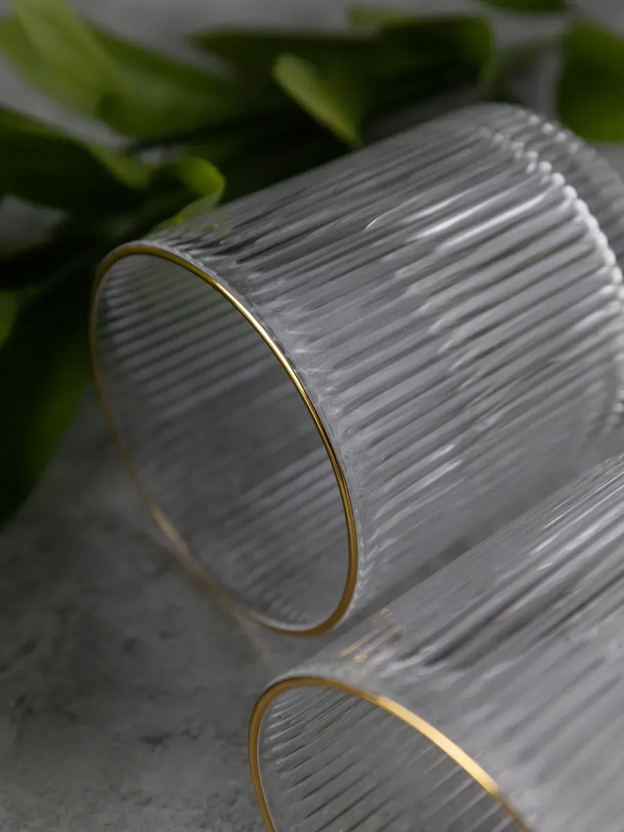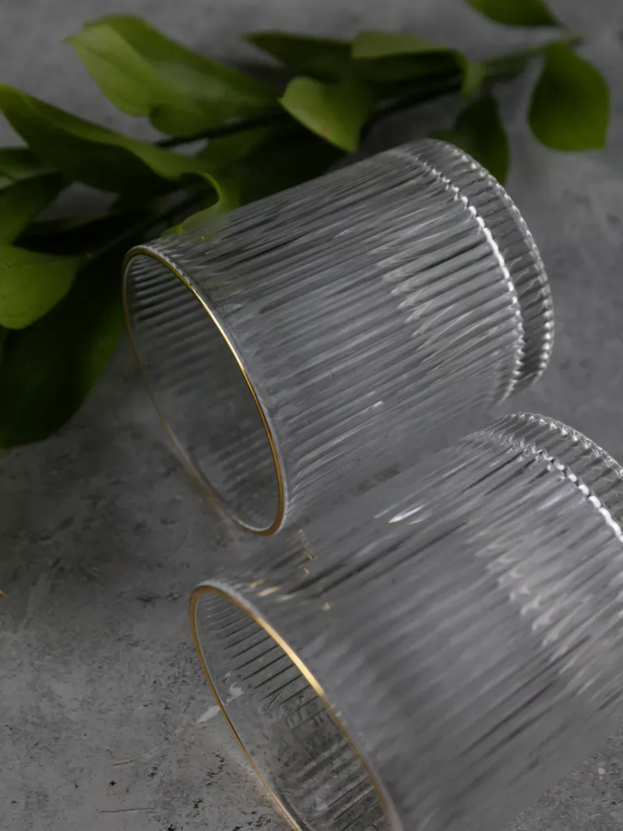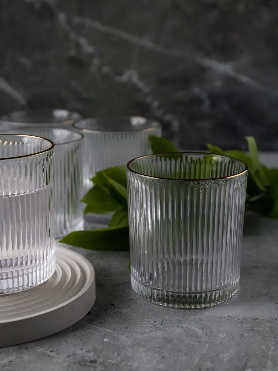 Набор бокалов "Нерпочка" - это стильное и практичное решение для сервировки стола. В комплект входит 6 рифленных бокалов объемом 350 мл, выполненных из прозрачного толстого стекла с изящной золотой каймой. Каждый бокал сделан вручную, линии утоплены глубоко, ровные, четкие. Благодаря ребристой поверхности бокалы удобно держать в руке, а прозрачное стекло подчеркивает красоту напитков. Универсальный дизайн бокалов позволяет использовать их для подачи различных напитков, таких как виски, вода, сок и другие. Набор станет прекрасным дополнением к любому домашнему бару или праздничному столу, придав ему элегантный и утонченный вид. Изготовленные из высококачественного стекла, бокалы не впитывают запахи и легко моются, что обеспечивает их долговечность и удобство в использовании.