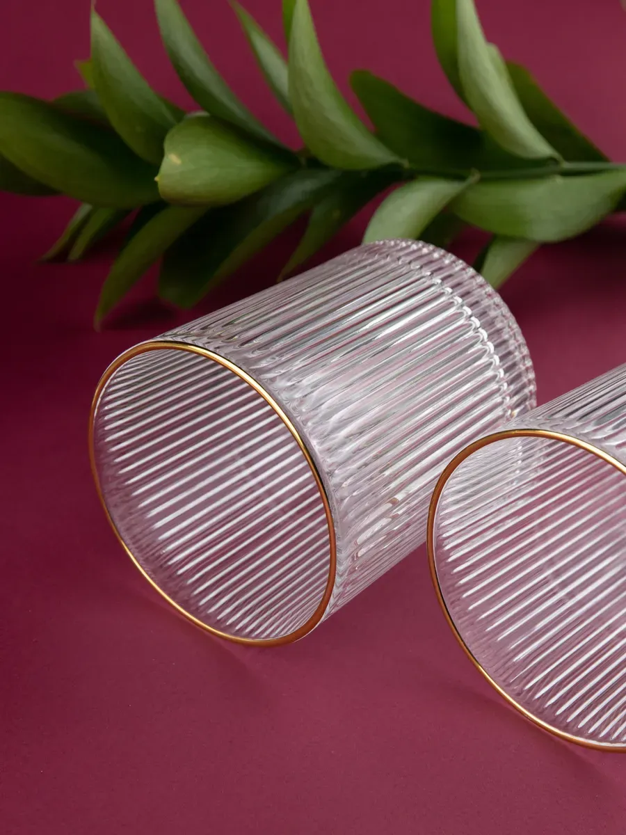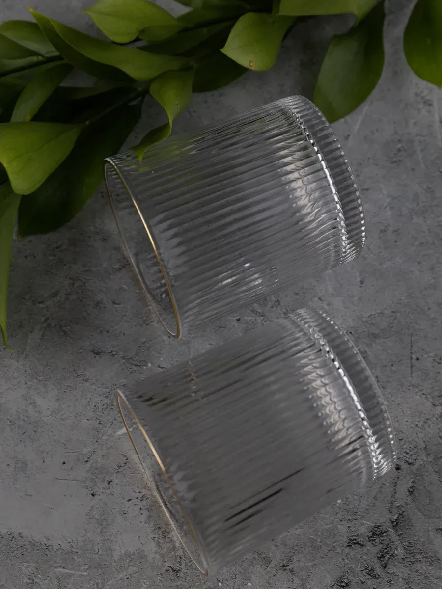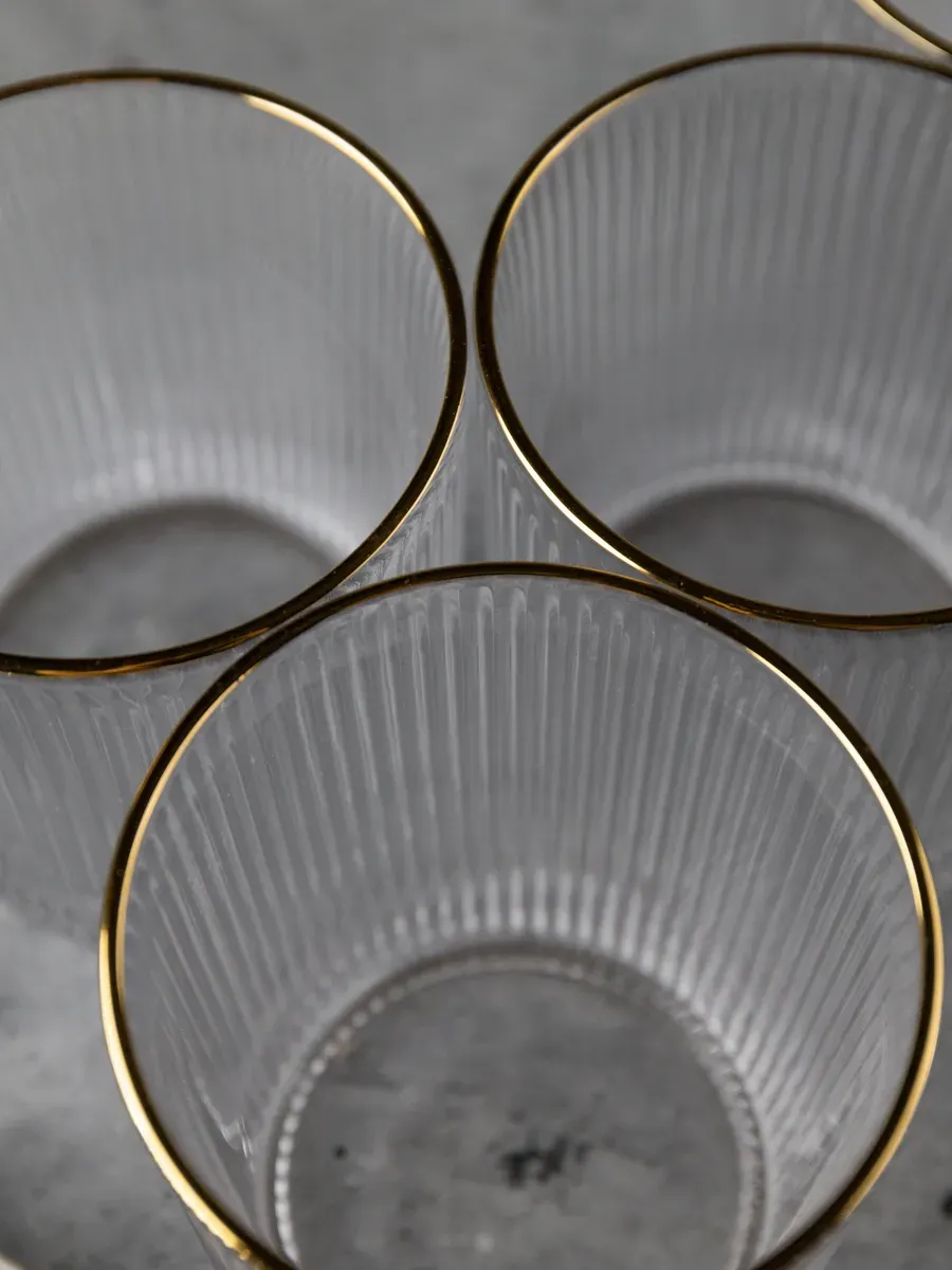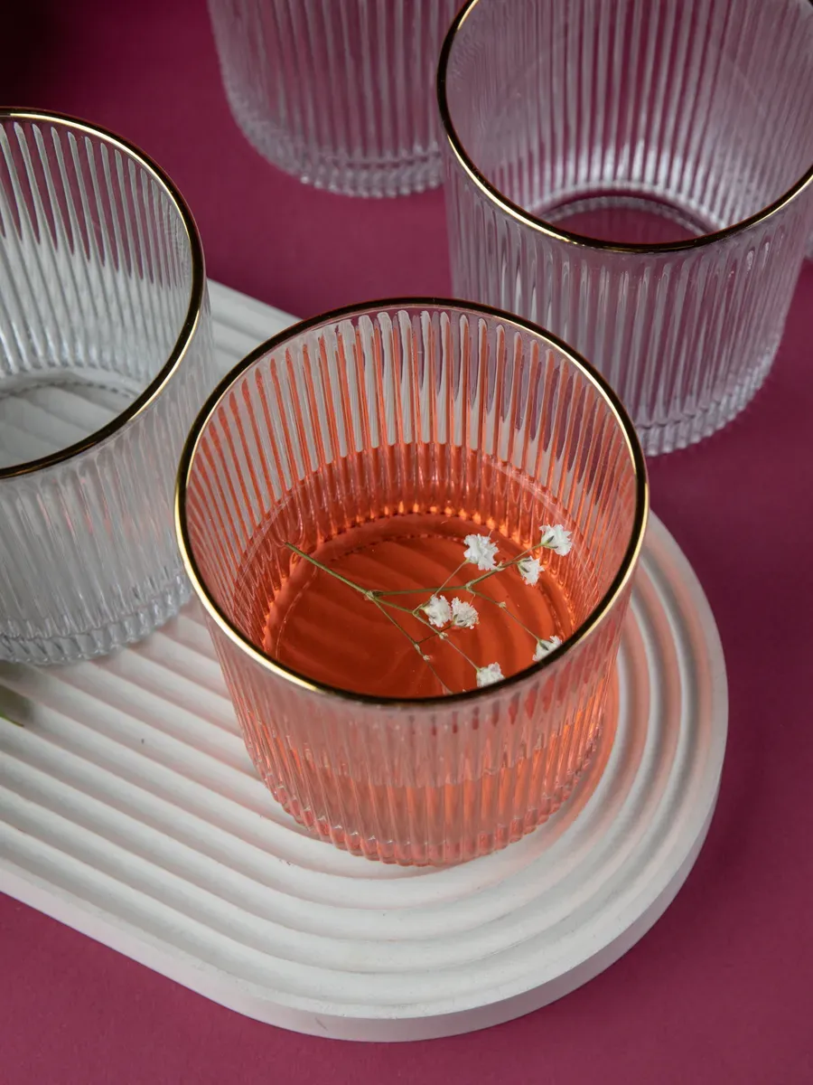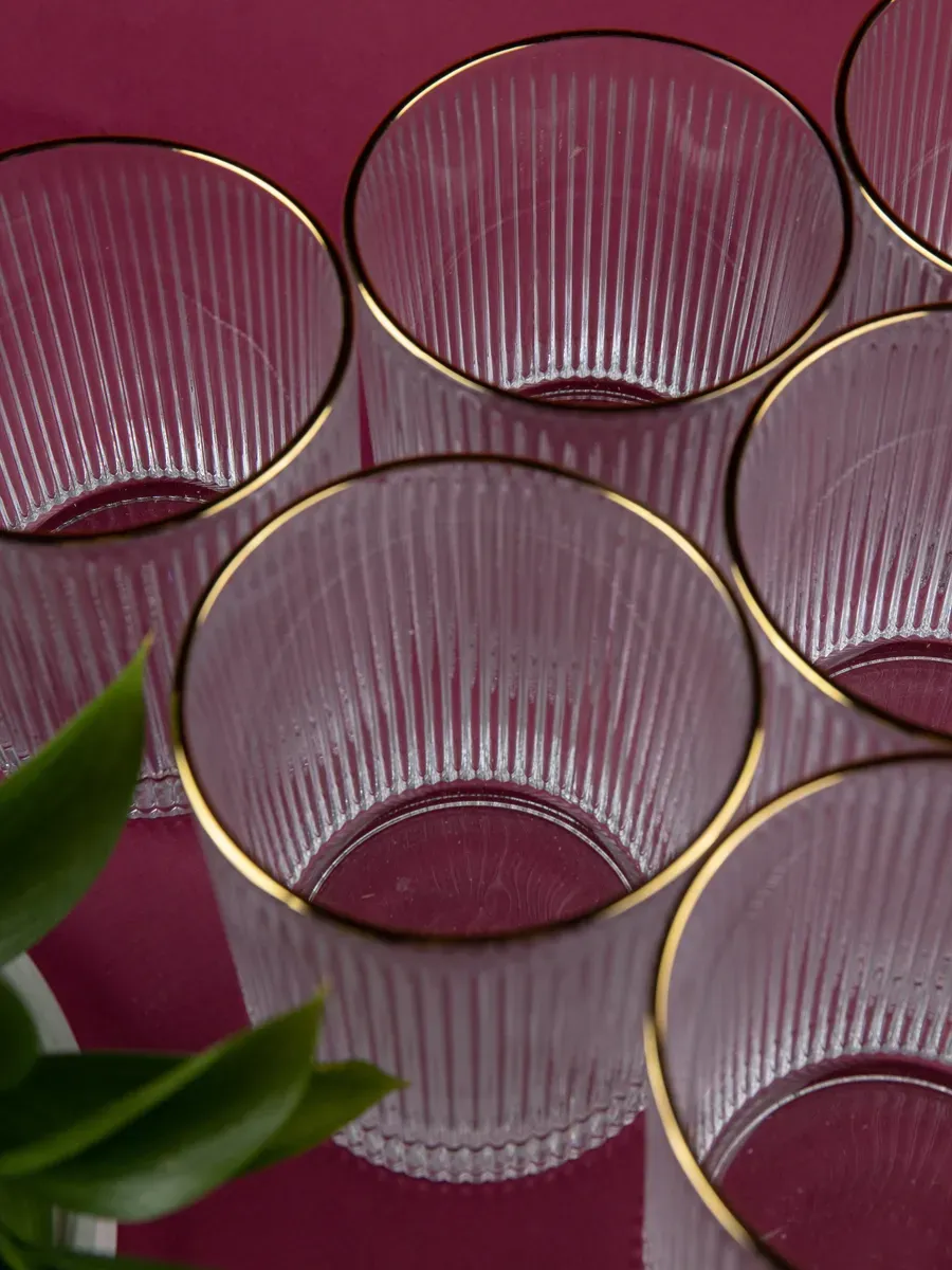 Набор бокалов "Нерпочка" - это стильное и практичное решение для сервировки стола. В комплект входит 6 рифленных бокалов объемом 350 мл, выполненных из прозрачного толстого стекла с изящной золотой каймой. Каждый бокал сделан вручную, линии утоплены глубоко, ровные, четкие. Благодаря ребристой поверхности бокалы удобно держать в руке, а прозрачное стекло подчеркивает красоту напитков. Универсальный дизайн бокалов позволяет использовать их для подачи различных напитков, таких как виски, вода, сок и другие. Набор станет прекрасным дополнением к любому домашнему бару или праздничному столу, придав ему элегантный и утонченный вид. Изготовленные из высококачественного стекла, бокалы не впитывают запахи и легко моются, что обеспечивает их долговечность и удобство в использовании.