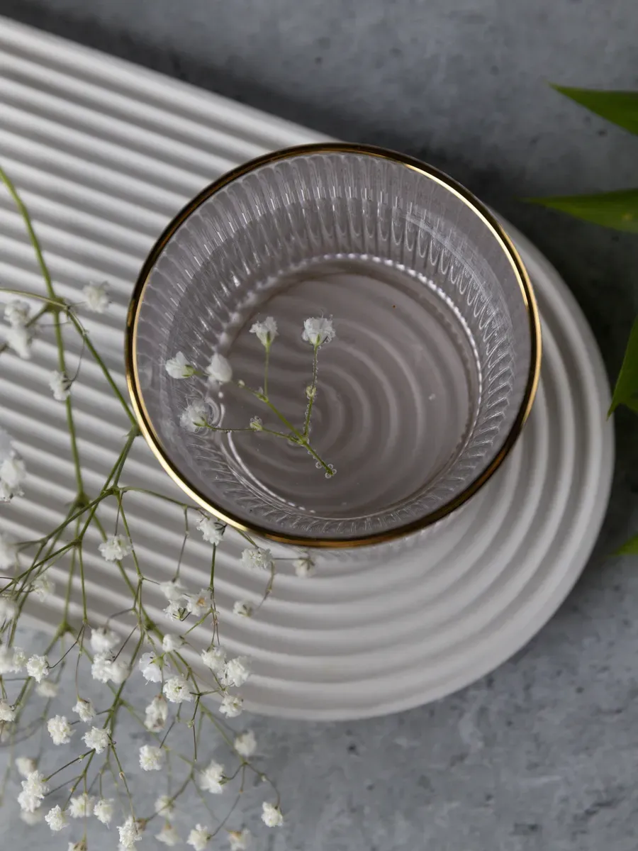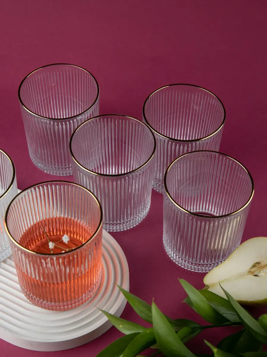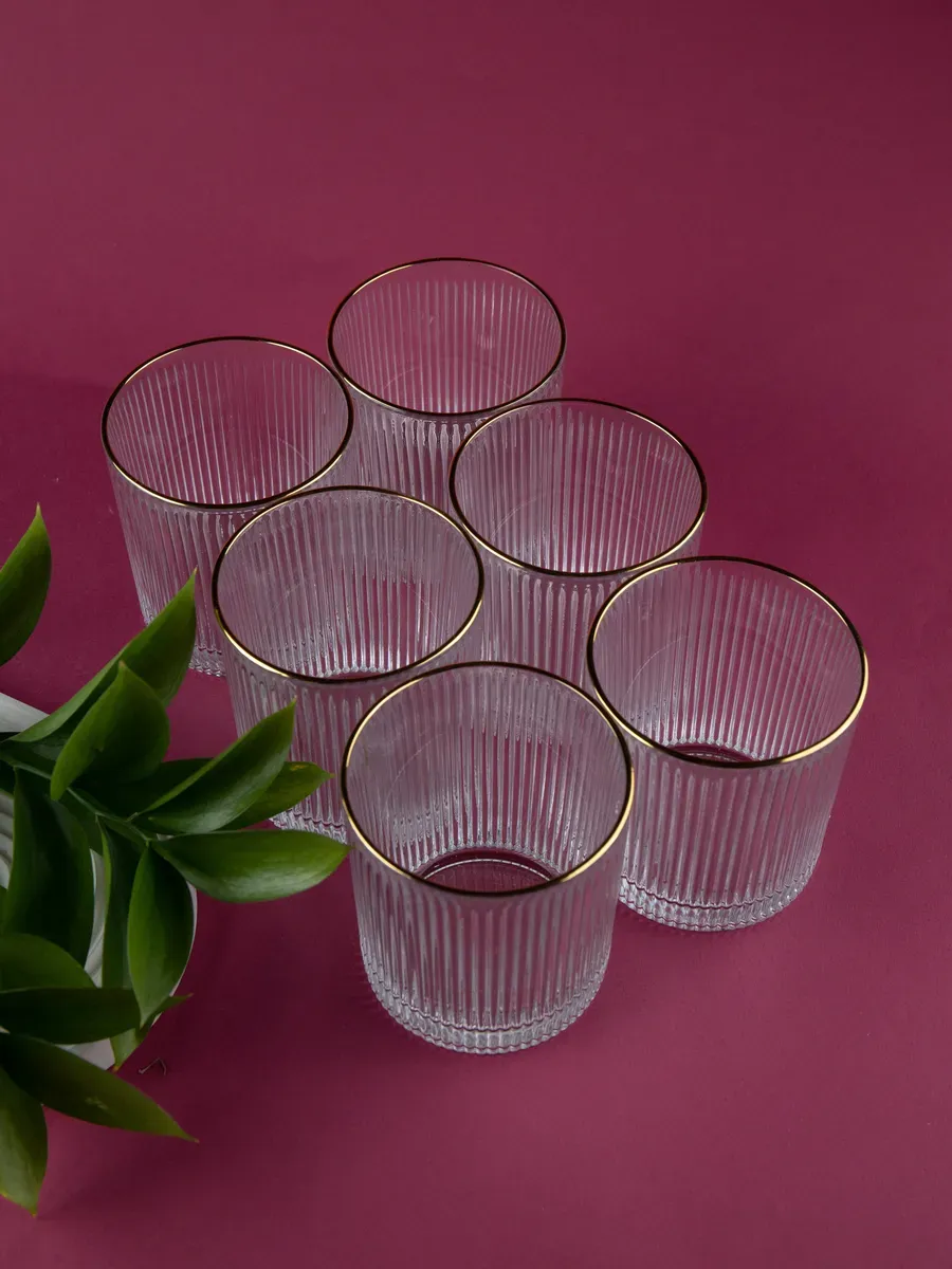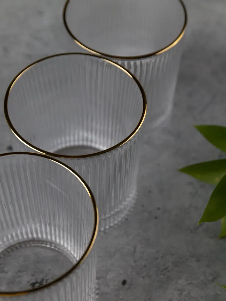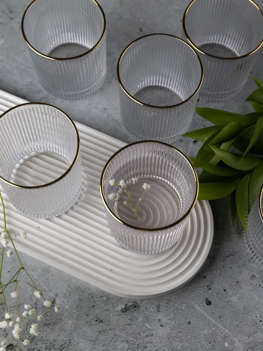 Набор бокалов "Нерпочка" - это стильное и практичное решение для сервировки стола. В комплект входит 6 рифленных бокалов объемом 350 мл, выполненных из прозрачного толстого стекла с изящной золотой каймой. Каждый бокал сделан вручную, линии утоплены глубоко, ровные, четкие. Благодаря ребристой поверхности бокалы удобно держать в руке, а прозрачное стекло подчеркивает красоту напитков. Универсальный дизайн бокалов позволяет использовать их для подачи различных напитков, таких как виски, вода, сок и другие. Набор станет прекрасным дополнением к любому домашнему бару или праздничному столу, придав ему элегантный и утонченный вид. Изготовленные из высококачественного стекла, бокалы не впитывают запахи и легко моются, что обеспечивает их долговечность и удобство в использовании.
