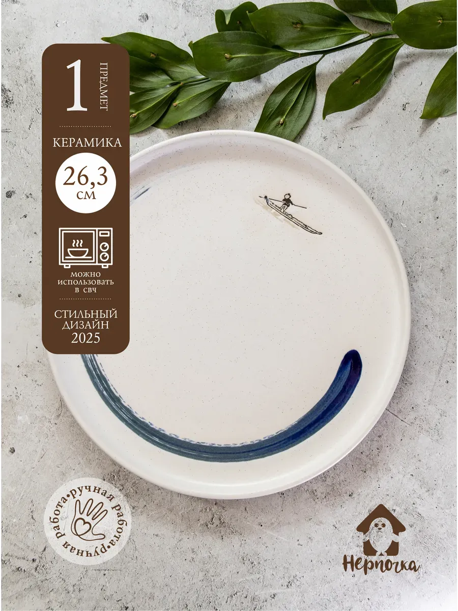 Тарелка ручной работы "Серфер" от бренда "Нерпочка". Желаем при каждом использовании тарелки с бортами, чтобы серфер напоминал вам, о свободе во всех ее проявлениях, что вы всегда можете отправиться в путешествие и вдохнуть ласковый бриз моря или океана. Также как и серфер на тарелке, не задумываясь не о чем, взять доску и отправиться покорять волны. Диаметр 26.3 см
